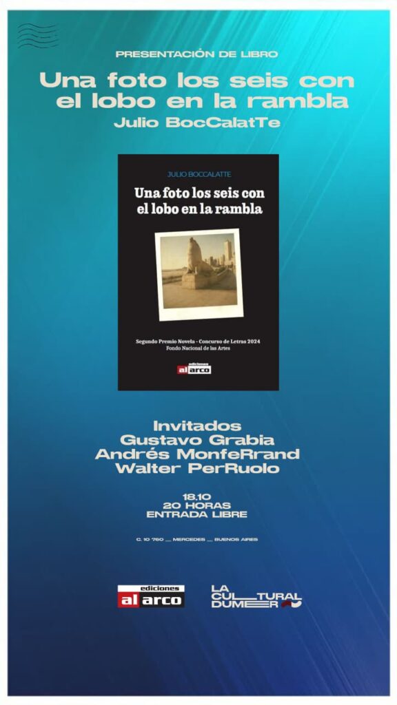 Este sábado 18 de octubre, a las 20 horas, en La Cultural Dumer se presenta “Una foto los seis con el lobo en la rambla”, la nueva novela de Julio Boccalatte, ganadora del Segundo Premio de Novela del Fondo Nacional de las Artes 2024.