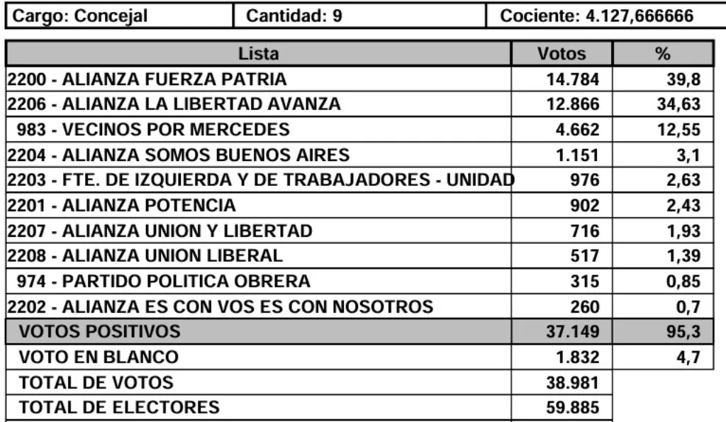 El documento del escrutinio detalla la ratificación de los guarismos generales, garantiza que la agrupación local Vecinos por Mercedes asegurará las dos bancas en el HCD, tal como se había anticipado en el conteo preliminar. El vecinalismo cosechó 4.662 votos, lo que representa un 12,55 % del total de votos positivos en la elección.