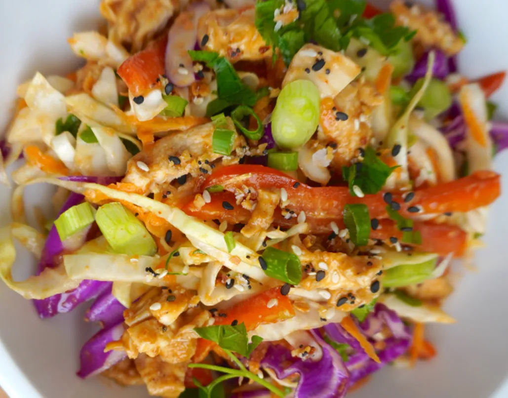 Aderezar los repollos, la lechuga, la menta y los brotes. Acomodarlos en una fuente con los bastones de pollo, decorar con cilantro y servir con masitas saladas o tostadas