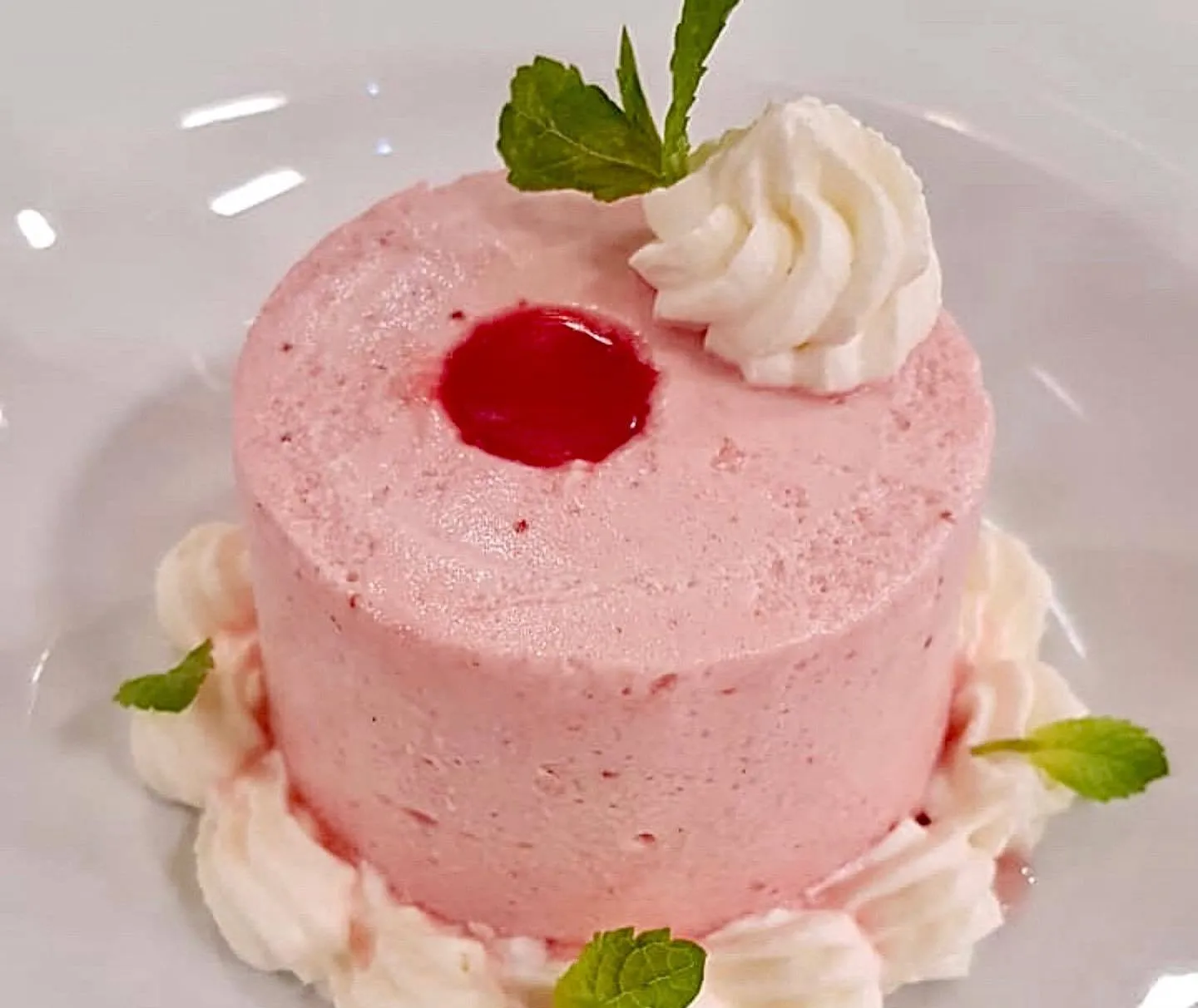 Distribuir en los moldecitos ligeramente humedecidos y llevarlos a la heladera 4 horas. Desmoldar y rodear con la frutilla restante. O servir en copas decorando con cuartos de frutillas o frutos rojos a gusto.
