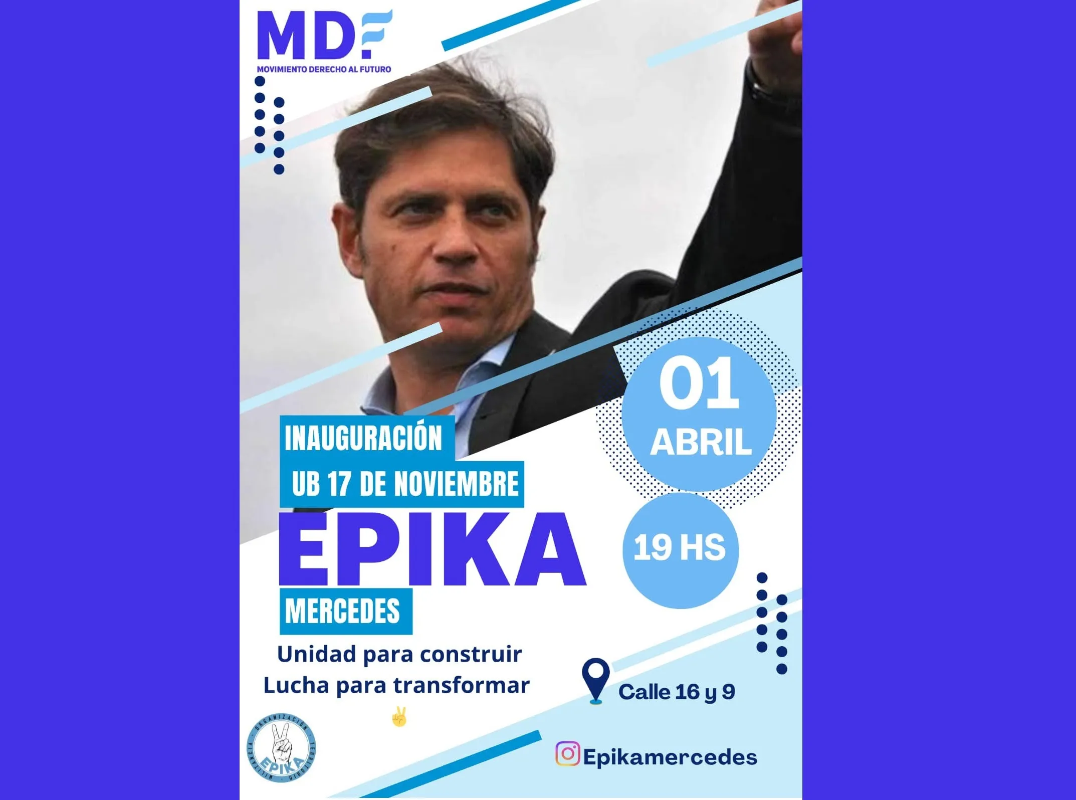 Epika es una agrupación orientada al peronismo, tiene como referentes la figura actual del gobernador Axel Kicillof, el ministro de Desarrollo de la Comunidad PB Andrés (Cuervo) Larroque, y el referente territorial, Damián Rilo. Anuncia oficialmente la inauguración de su sede partidaria en nuestra ciudad, buscando reunir a referentes provinciales, locales militantes y vecinos de la ciudad, entre los que se encuentran Andrea Ricaldi, Jorge Collado y Jorge “Yuyo” Montaldo, quienes están cursando las invitaciones a todo el arco político local.