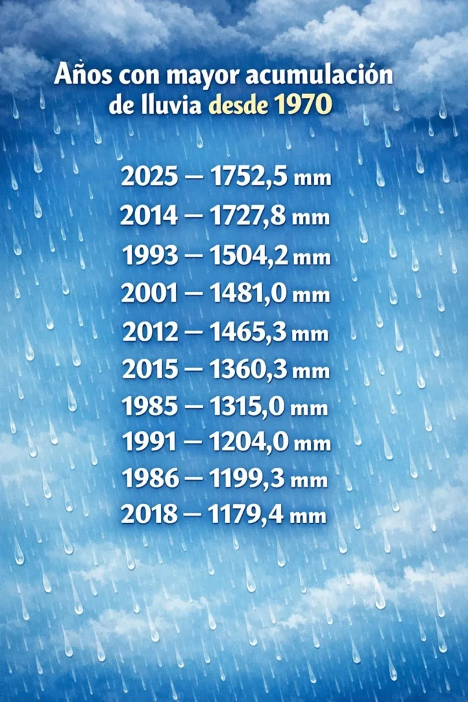 Resulta notable observar cómo el año 2014, que hasta hace poco ostentaba el primer lugar con 1.727,8 mm, ha quedado relegado al segundo puesto tras la intensidad pluvial de 2025.