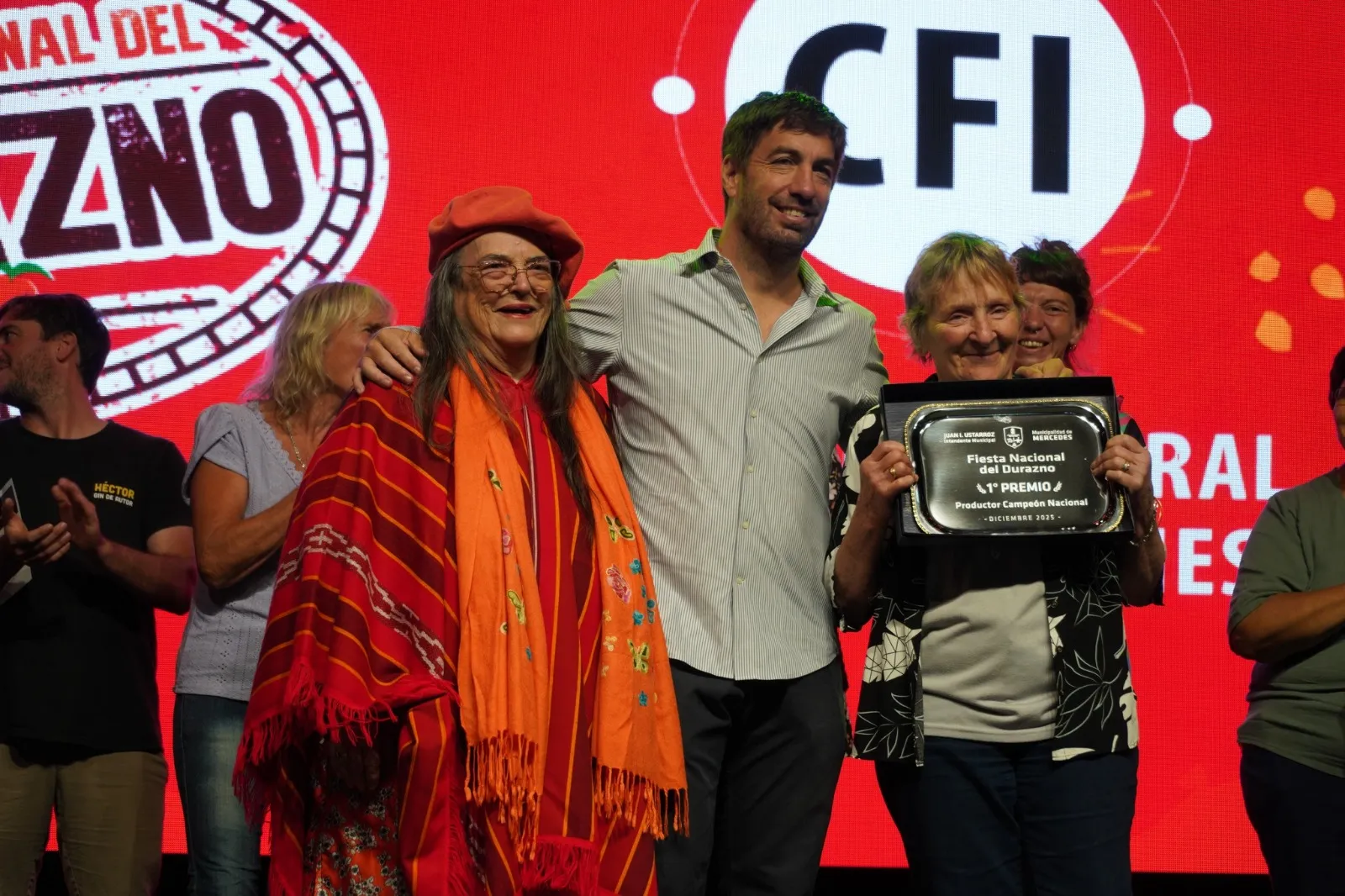 Finalmente, se rindió homenaje a los pioneros del sector, reconociendo a los descendientes de Juan Ángel Ferrari y Raúl Pescio, presidente y vicepresidente, respectivamente, de la primera Comisión de Fruticultores de Mercedes.