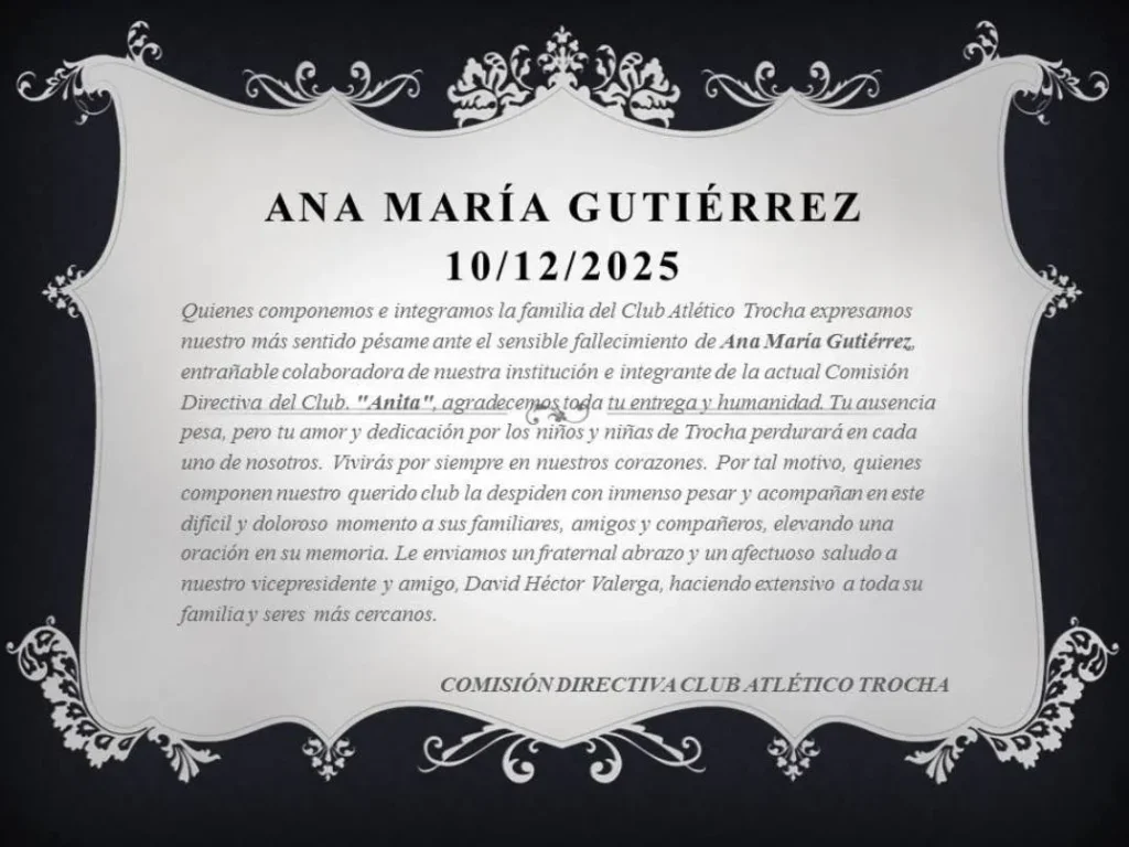 † Ana María GUTIÉRREZ de VALERGA. Q. E. P. D. Falleció el 10 de Diciembre de 2025. C. A. S. R. y B. P. Su esposo: David Héctor Valerga; sus hijas: Eva Soledad, María Belén, Ana Clara, María Elina y María Paz Valerga; su hijo político: Matías Rodríguez; sus nietos: Camila, Aitana y Augusto; sus hermanos; sus hermanos políticos; sus sobrinos; sus primos y demás deudos, participan su fallecimiento y que sus restos fueron cremados en el Crematorio del Cementerio Parque de Mercedes, el miércoles 10 de diciembre, previo responso oficiado en la Iglesia Catedral a las 17,30 hs. Casa de duelo: 27 Nº 810. GRUPO PARQUE. Calle 29 Nº 330, Tel. 423510/420022/426704. (60 años, ama de casa)