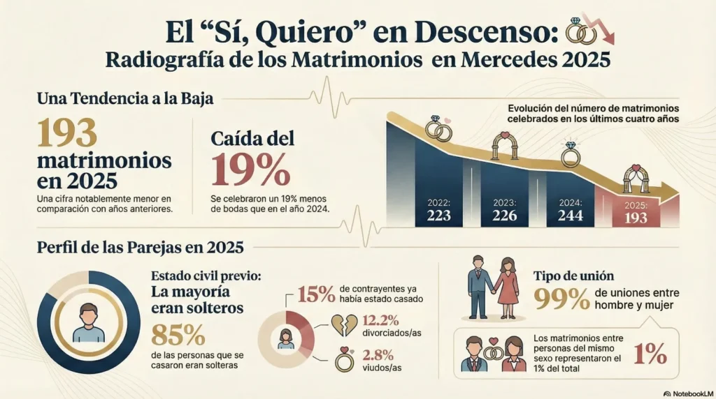 Los datos oficiales del 2025 revelan una marcada tendencia a la baja en la formalización de uniones en la ciudad. Con solo 193 casamientos registrados, la cifra se aleja de los números alcanzados en años anteriores, reflejando un cambio en las decisiones sociales de los mercedinos.