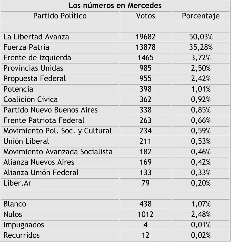 Mercedes no es una isla como siempre solemos decir y lo sucedido a nivel nacional y provincial también se repitió en el distrito donde más de la mitad de los votantes pusieron la cruz en el casillero violeta. Es una buena señal para el proyecto nacional, pero una interpelación a la dirigencia local libertaria cuyo respaldo en las urnas en septiembre se retaceó.